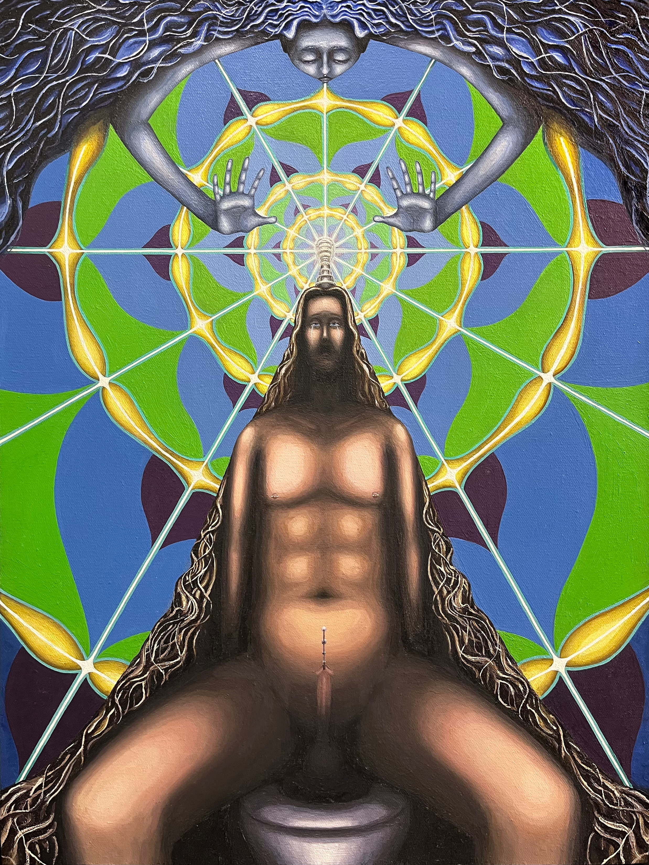 This painting is a series with “Jesus Christ”. Another Male god figure oil portrait painting of mine, based on a mushroom vision from the same time period.